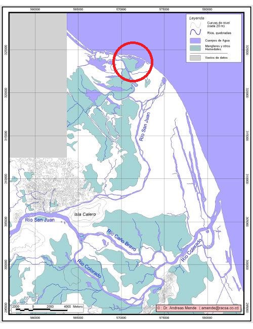 Mapa de la zona conocida como “Isla Calero” correspondiente al delta del río San Juan entre Costa Rica y Nicaragua. En el círculo rojo dibujado por el autor, la zona conocida como “Isla Portillos”. Figura facilitada por el Dr. Allan Astorga Gattgens, Profesor, Escuela Centroamericana de Geología, UCR.Como puede apreciar visualmente nuestro lector, declarar que “Nicaragua ocupa Isla Portillos ilegalmente” no es igual a declarar que “Nicaragua ocupa Isla Calero ilegalmente” dada la diferencia de superficie entre ambos.