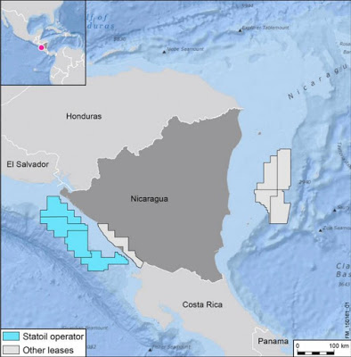 Cabe señalar que en junio del 2015, Costa Rica anunció a la prensa haber advertido a la empresa noruega Statoil de sus pretensiones: revisando el mapa de bloques concesionados por Nicaragua a la empresa Statoil (en azul celeste en esta nota, reproducido infra), se plantean algunas interrogantes sobre las reglas que podrían permitirle a Costa Rica extender su jurisdicción a estas zonas concesionadas. Hemos hecho la consulta a diversos especialistas sin obtener referencia a alguna disposición de la Convención de Derecho del Mar de 1982 a la que son parte ambos Estados.