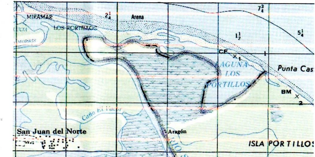 Mapa cartográfico publicado por el Instituto Geográfico Nacional o IGN (Costa Rica) en el que se detalla cómo la frontera bordea la Laguna de Portillos (Mapa “Punta Castilla” 3448-II, 1:50.000). Nótese que el playón ubicado al Norte de la laguna de Portillos no es considerado comoperteneciente a Costa Rica en su cartografía oficial, al menos hasta el 2015