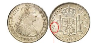 Presentamos a manera de ejemplo una Moneda Española, de Ocho Reales, Acuñada por Orden del Rey Carlos IV, en la Real Casa de la Moneda de la Ciudad de Lima (en el círculo su monograma), en 1793, para que circule por todo el territorio del Imperio Español.
